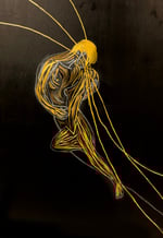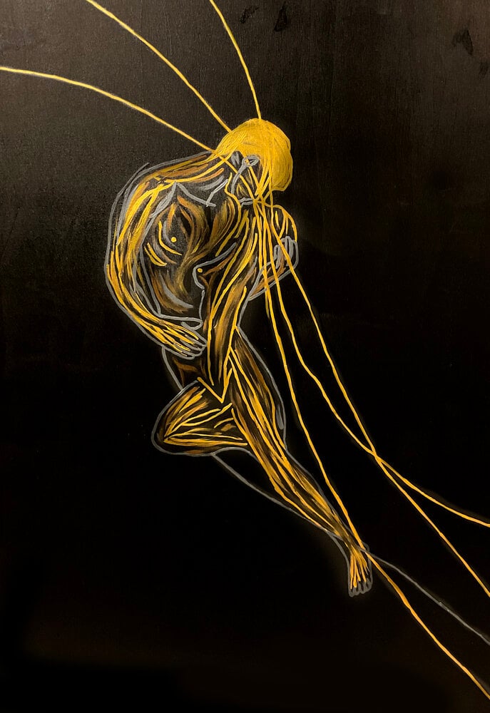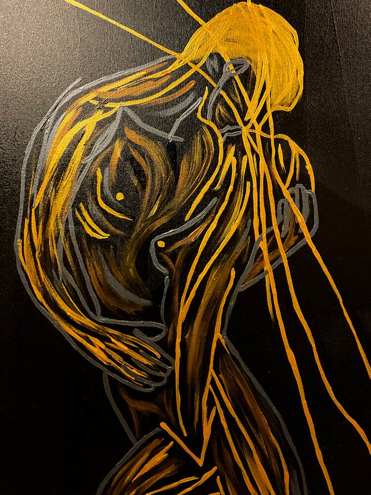 In a suspended curl of surrender, she holds her own heart. Her body, traced in molten gold, is not weakened — it is woven with fire. The lines do not merely bind; they illuminate, pulling her closer to herself.