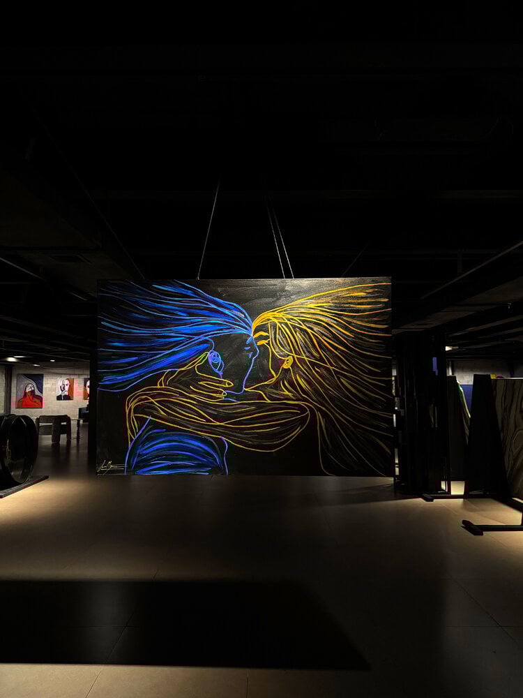 Only nine hand-painted editions of Gravity XXI exist worldwide. Acrylic strokes and bold gestures reveal two figures suspended between tension and release — blue and gold colliding, merging, becoming one.