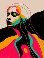 She is still — yet overflowing. Her outline bends like terrain shaped by time, a living map of tenderness and tension. Vivid lines pulse with memory, while her gaze extends beyond judgment. Intense VI is not decorative — every stroke is declaration. A portrait of emotional topography, where color becomes structure and quiet force holds her together.