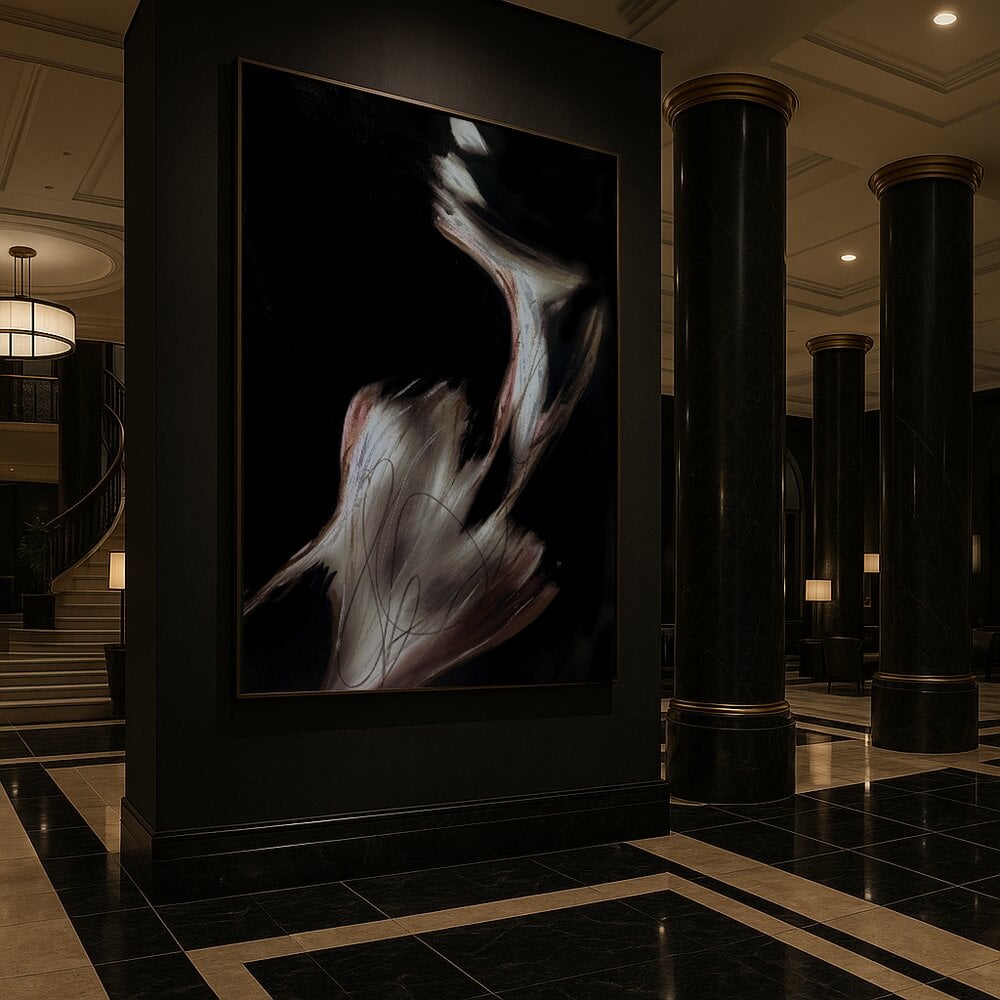 This composition captures the fleeting presence of sensual energy — a form dissolving into gesture, a body remembered through motion. Sweeping brushstrokes, raw textures, and fluid lines reveal both emergence and disappearance.
