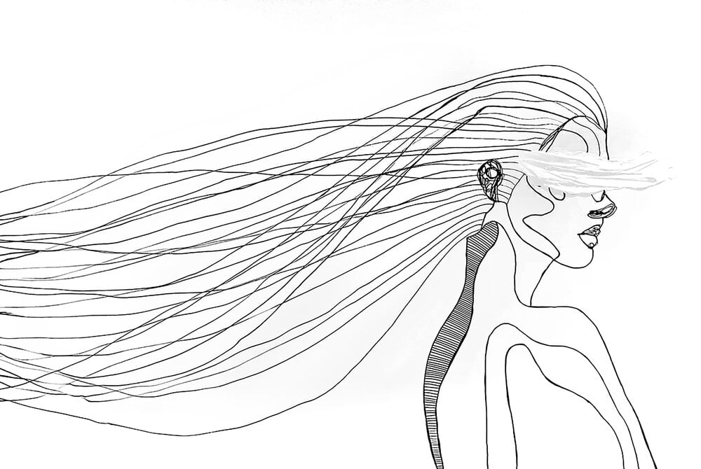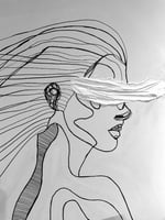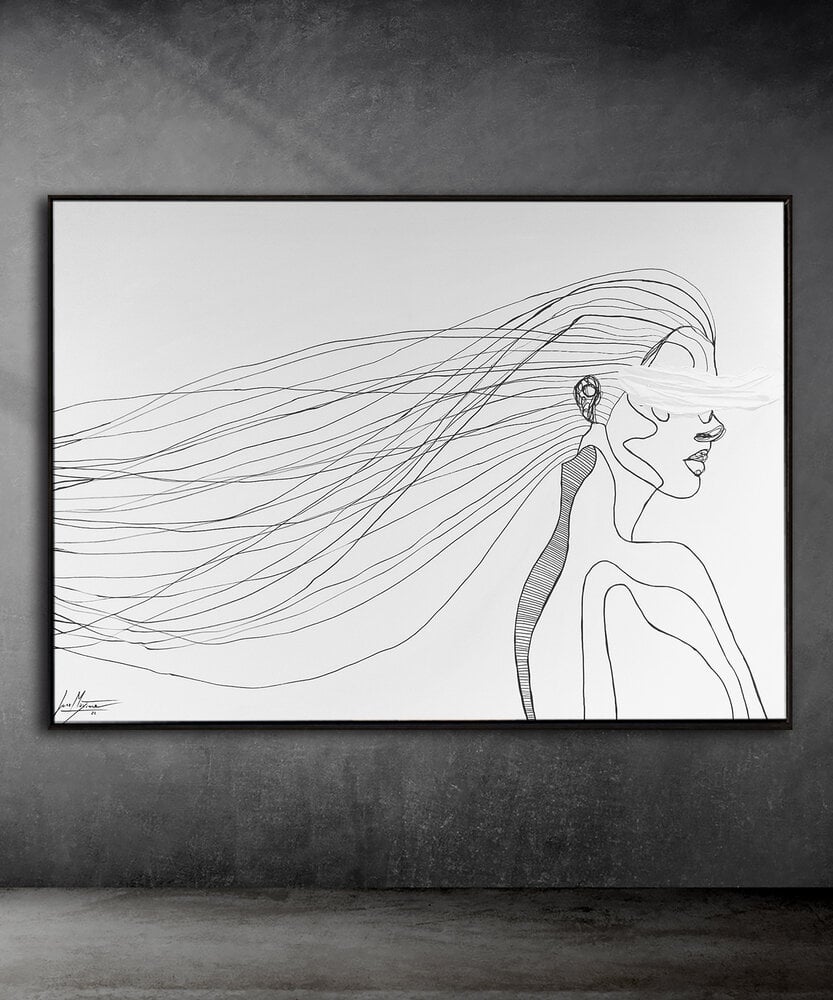 A feminine figure is swept by a silent wind — not made of air, but of memory. Her gaze is obscured by a thick white impasto stroke; she looks forward, yet turns inward. Her long hair flows outward in linear strands, expanding beyond the frame like echoes — delicate, infinite. She becomes the trace itself.