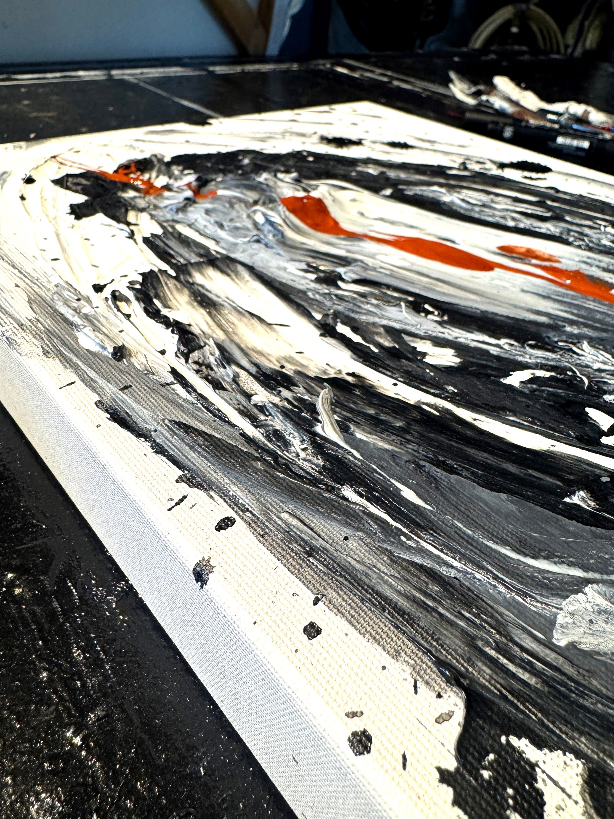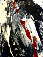 A violent burst of red slashes through black and white textures, evoking both rupture and release — the unconscious tearing itself open to reveal what hides beneath. Not an image of emotion, but emotion made flesh in paint.